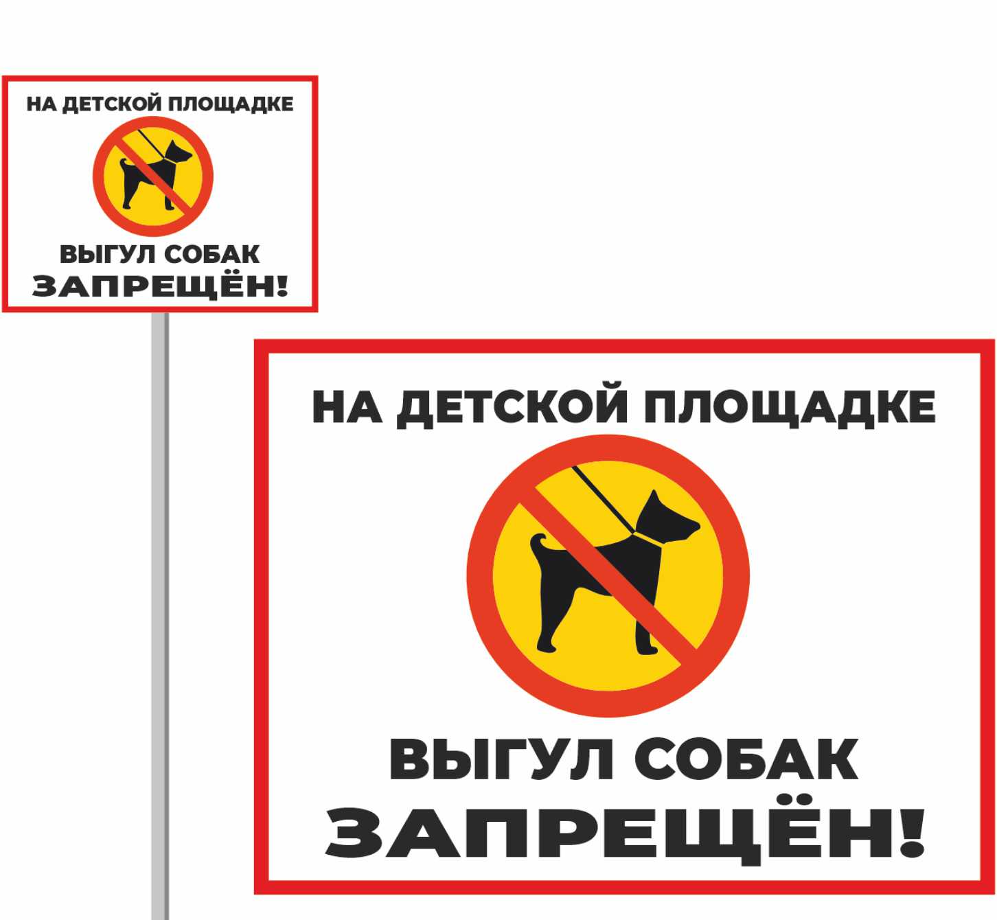 Мы изготавливаем качественные таблички ВЫГУЛ СОБАК ЗАПРЕШЕН любых размеров как из пластика ПВХ (4 мм) для наружного использования, так и из металла (алюминиевого композита). Материалы не подвержены атмосферным осадкам и прослужат не один год. По вашему желанию мы можем изготовить таблички сразу на металлической ножке и Вам останется только вбить их в землю радом с Вашим домом.